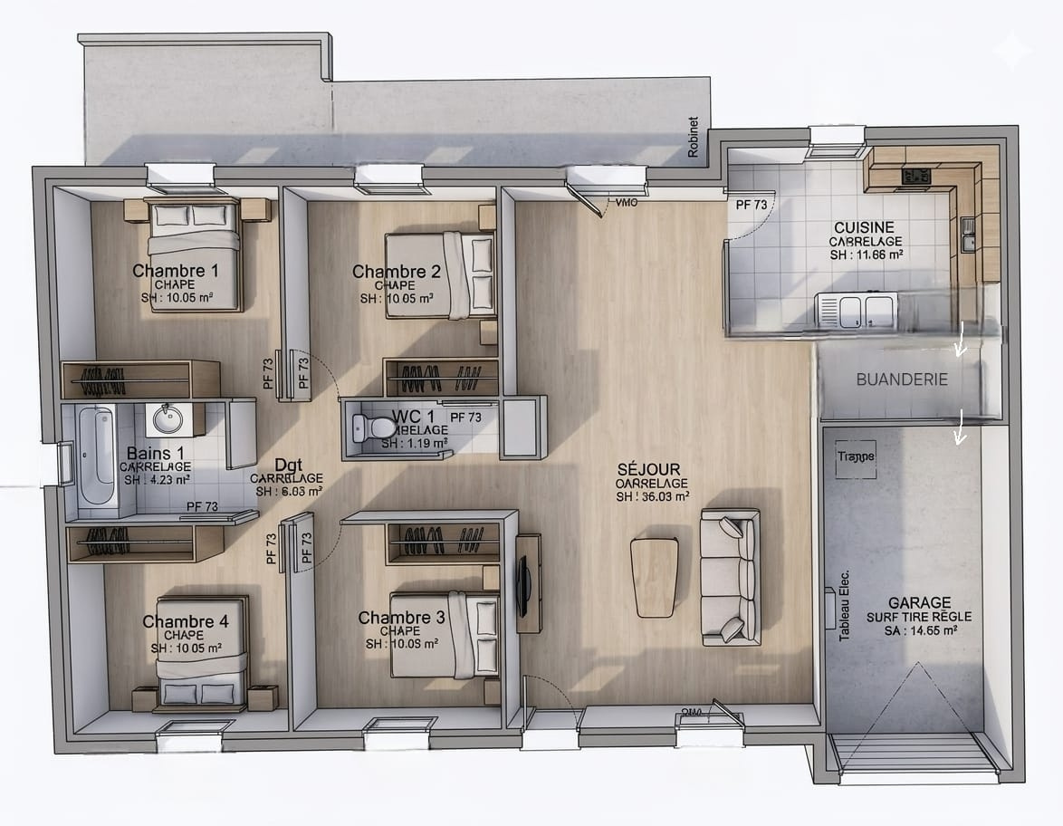 Pavillon de 2005 offrant de plain-pied une entrée sur pièce de vie de 36m² avec poêle à granules, une cuisine aménagée et équipée, une buanderie. Dégagement desservant une salle de bains, wc et 4 chambres. Garage. Grande terrasse avec store banne motorisé, adoucisseur et alarme.